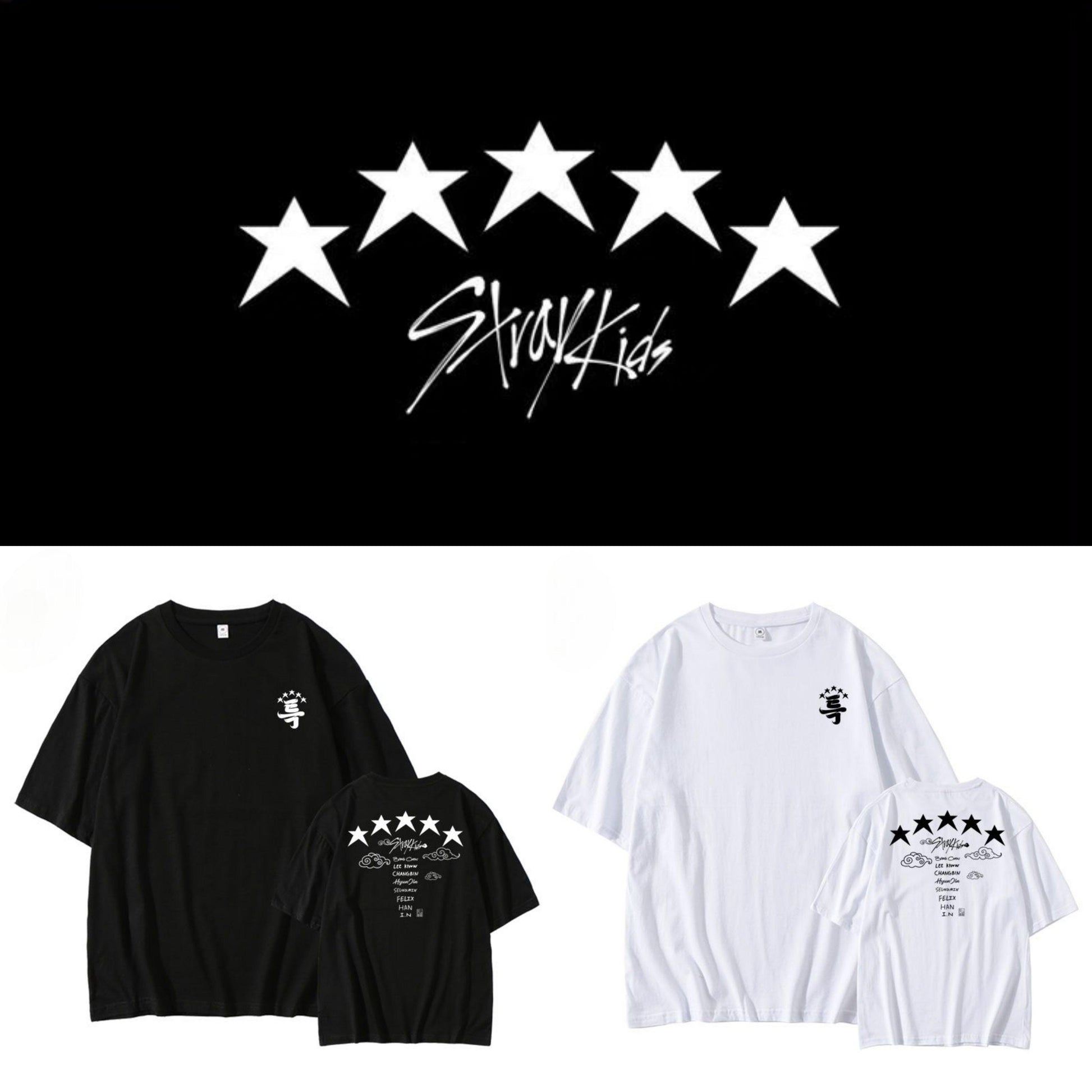 5 Star Stray Kids T-shirt: in 100% cotton fabric, available in sizes S to 3XL, in black and white, in a unisex model. Use and/or gift another stay!😍❤️